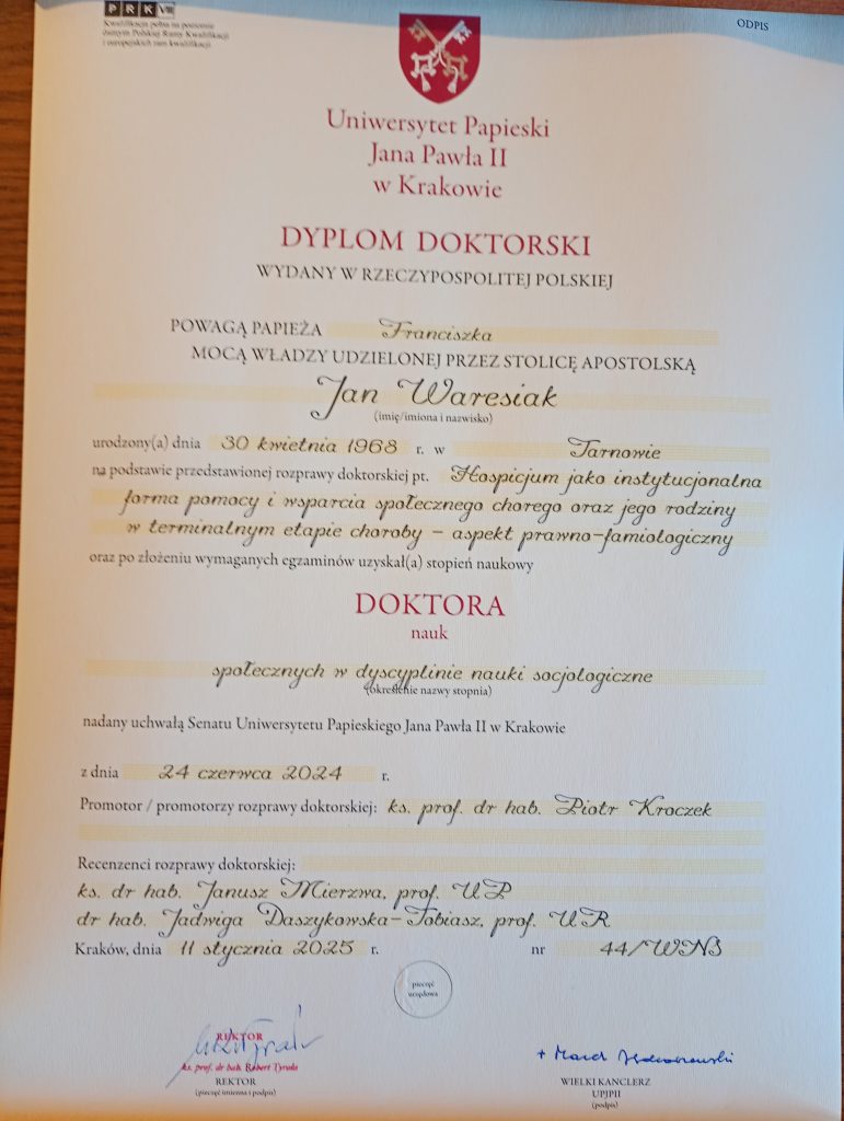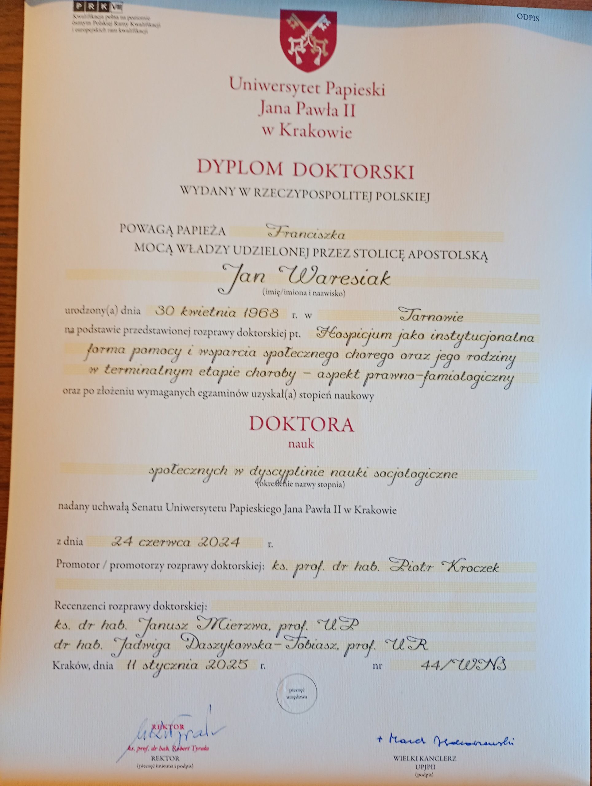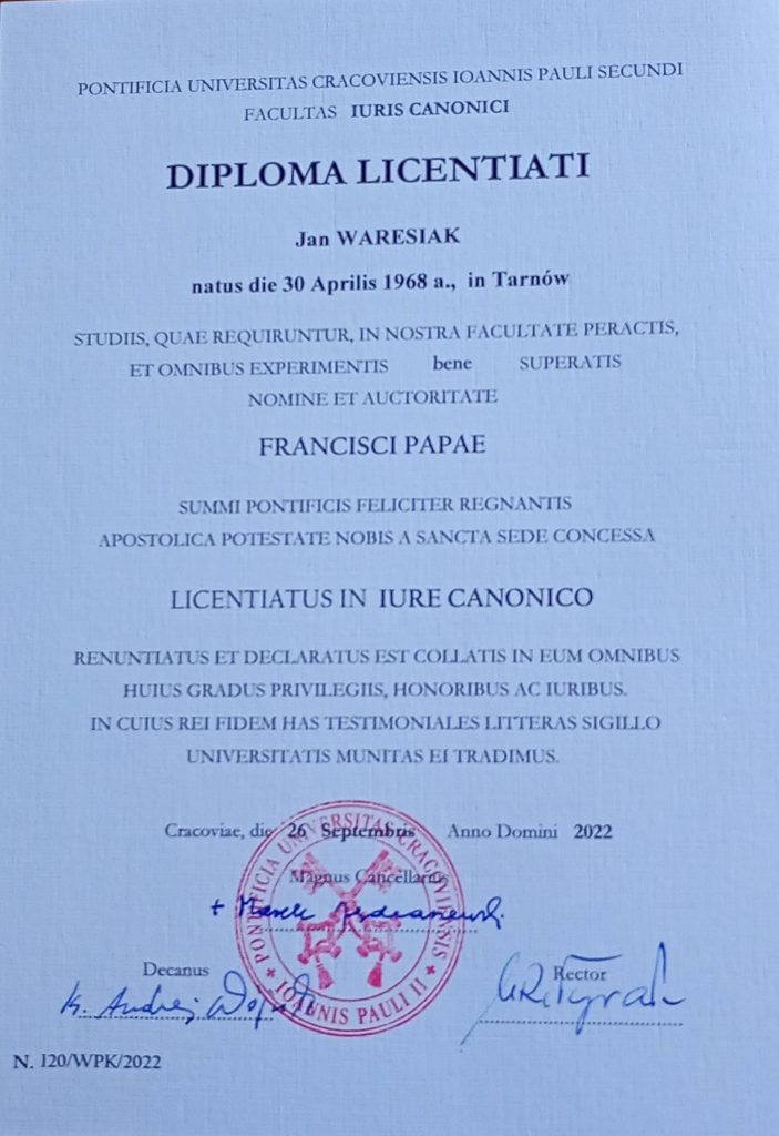 Jestem absolwentem Wydziału Prawa Uniwersytetu Jagiellońskiego oraz studiów z zakresu prawa kanonicznego na Uniwersytecie Papieskim Jana Pawła II w Krakowie, gdzie uzyskałem licencjat kościelny z prawa kanonicznego. Na tym samym uniwersytecie, na Wydziale Nauk Społecznych, uzyskałem tytuł doktora nauk społecznych w dyscyplinie nauki socjologiczne.