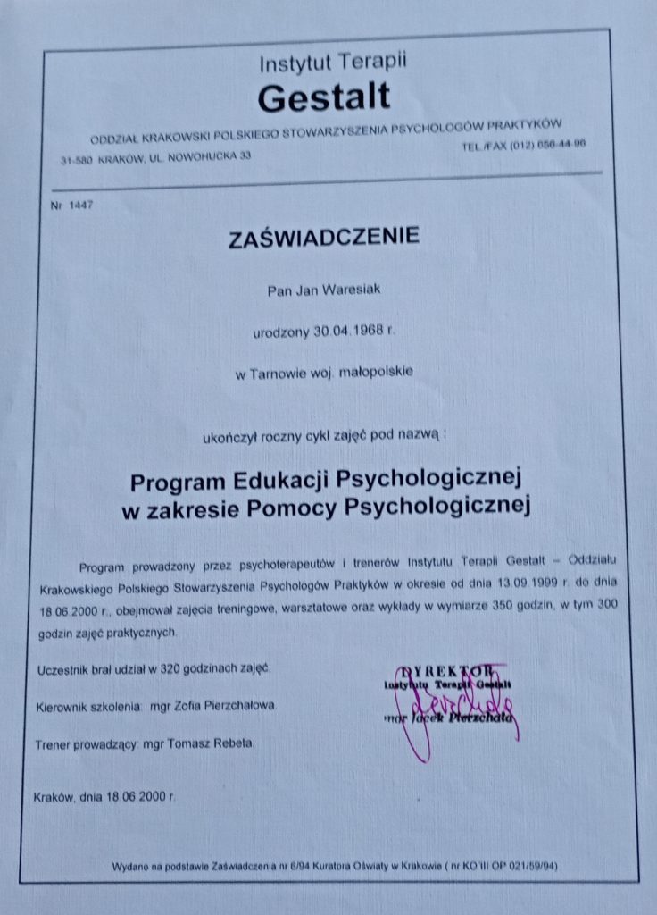 Ukończyłem również roczny Program Edukacji Psychologicznej w zakresie Pomocy Psychologicznej w Instytucie Terapii Gestalt – Oddział Krakowski Polskiego Stowarzyszenia Psychologów Praktyków, który pogłębił moje rozumienie komunikacji, emocji i sygnałów niewerbalnych. Czasem to właśnie to, co nie zostało powiedziane, wskazuje najważniejsze ścieżki do sprawiedliwego rozstrzygnięcia sprawy w świetle nauczania Kościoła. Umiejętność uważnego słuchana bardzo pomaga we właściwym zdiagnozowaniu każdego przypadku i dalszym prowadzeniu sprawy.